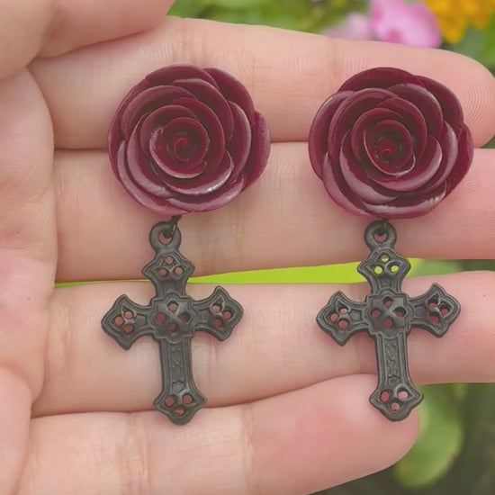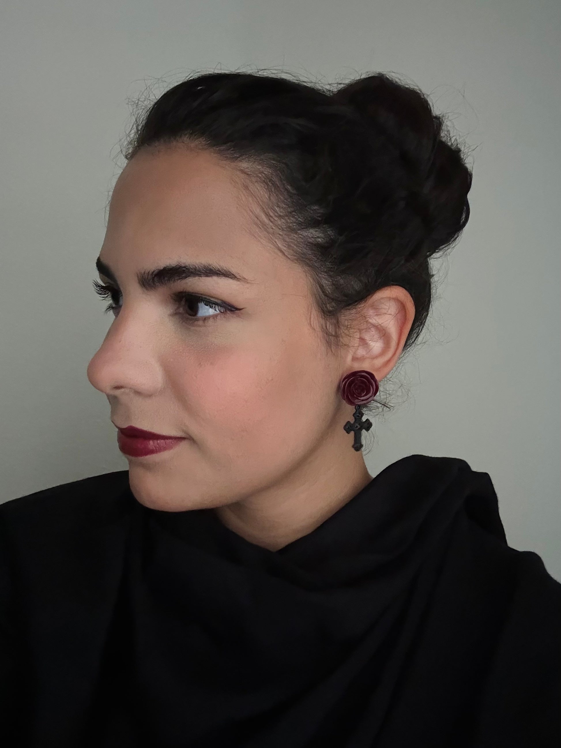 These earrings are sculpted to echo the solemn beauty of a cathedral’s rose window, rendered in deep maroon. Each piece is anchored by a hand-cast ornate cross, baroque in detail. A symbol of death, resurrection, and the sacred weight of memory.