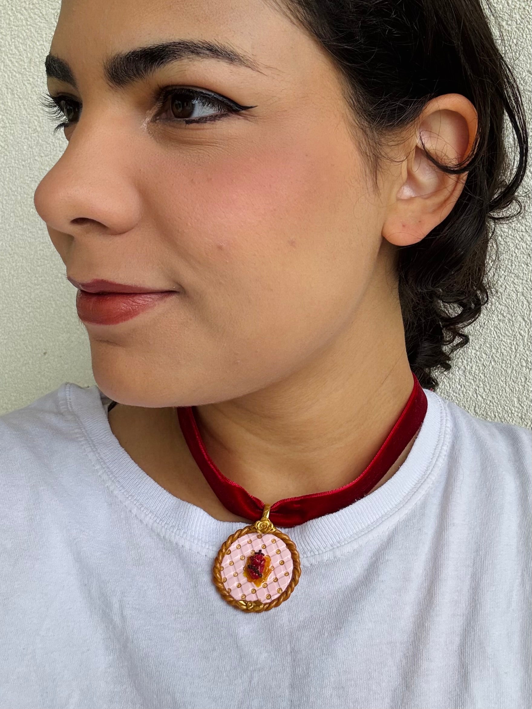 A vivid red ribbon encircles the neck, symbolizing passion and sacrifice, while the ornate Sacred Heart centerpiece gleams with rococo flourishes that echo the grandeur of 18th‑century art. Set against a playful pink polka‑dot backdrop, this piece balances reverence with whimsy, making it both a statement of faith and a bold fashion accessory. Perfect for those who want to embody beauty and divine mystery in a single glance.